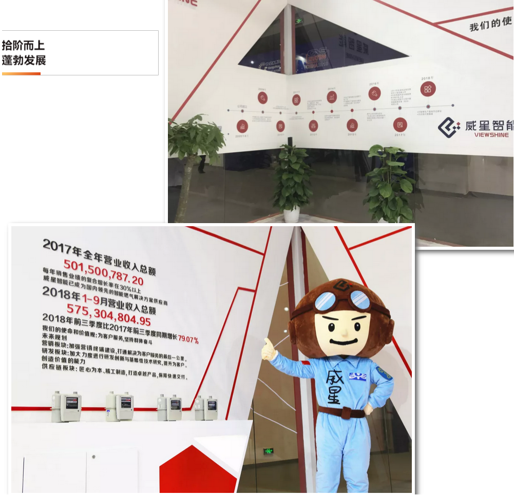 我们设立了企业发展专区,展现威星智能一路“拾阶而上,蓬勃发展”的历程。威星智能从2005年成立至今,一路快速发展,现在已成为国内领先的智能燃气解决方案供应商。2017年全年营业收入总额超5亿(不含税),2018年1-9月营业收入总额超5.753亿(不含税),2018前三季度较2017前三季度同期增长79.07%。