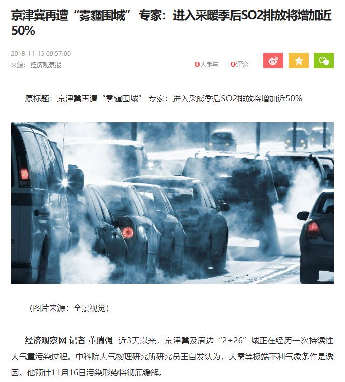 2018-11-15 12:0111月中旬以来天气转冷,昼夜温差变大,全国多地已进入采暖季,雾霾天也在全国各地悄然露头,蠢蠢欲动。