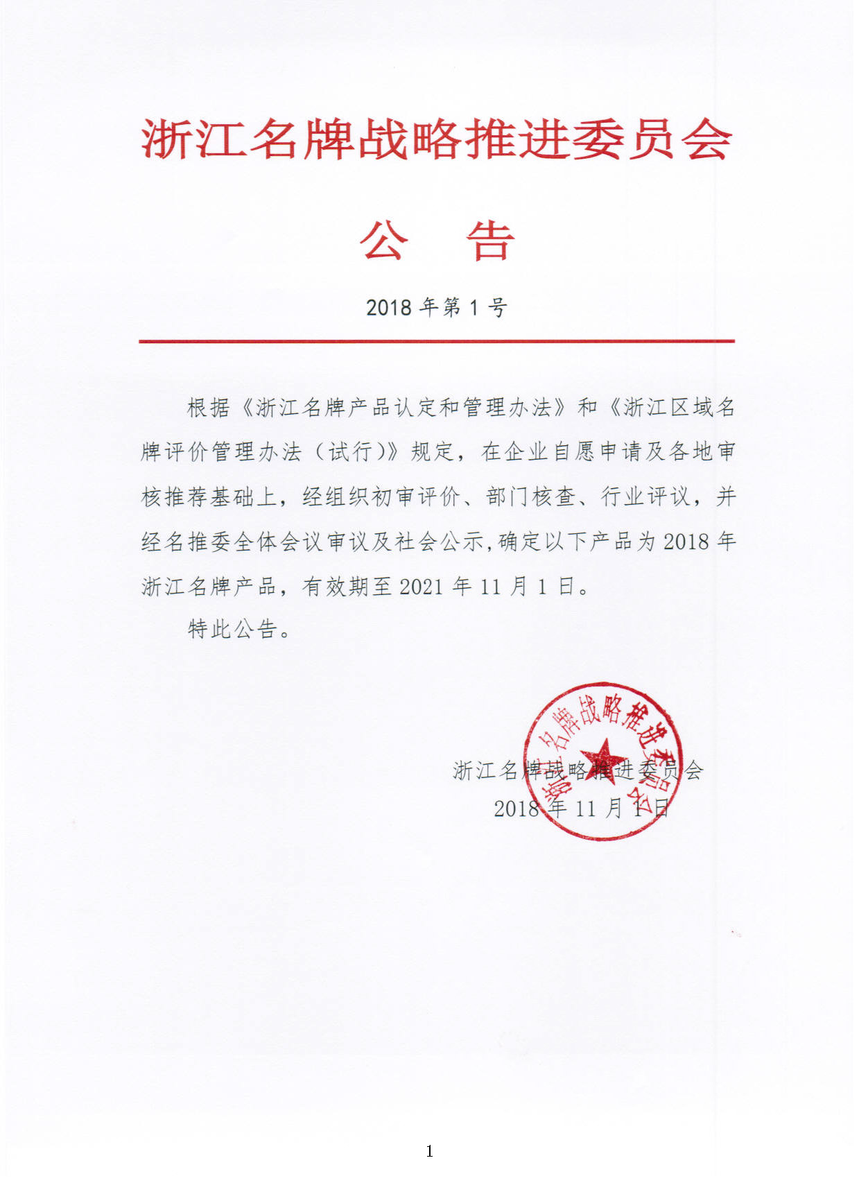 为贯彻落实《中共浙江省委浙江省人民政府关于开展质量提升行动的实施意见》(浙委发 [2018] 27号),持续深入打好“三强一制造”转型升级组合拳,推动品牌梯度培育体系建设,根据《浙江名牌产品认定和管理办法(试行)》、《浙江区域名牌评价管理方法(试行)》的要求,在企业自愿申请及各地审核推荐基础上,浙江省名牌战略推进委员会经初审评价、部门核查、行业评议、名推委全体会议审议及社会公示,将全省236个工业产品评为2018年浙江名牌产品,威星智能的智能燃气表成功入选。